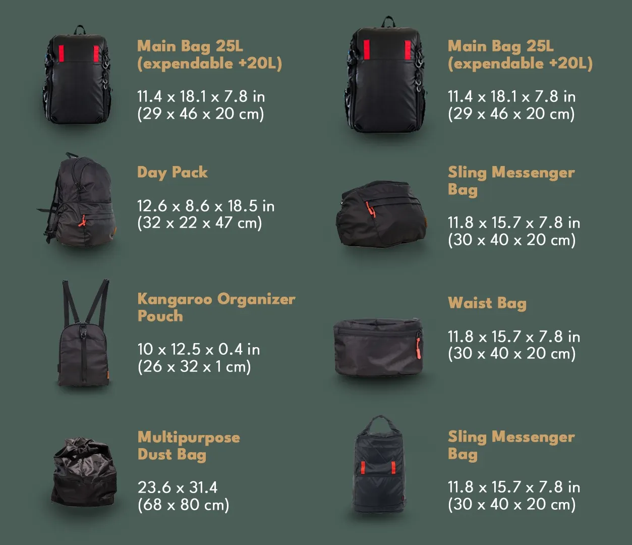 Each bag component can be used on its own for each unique purpose.