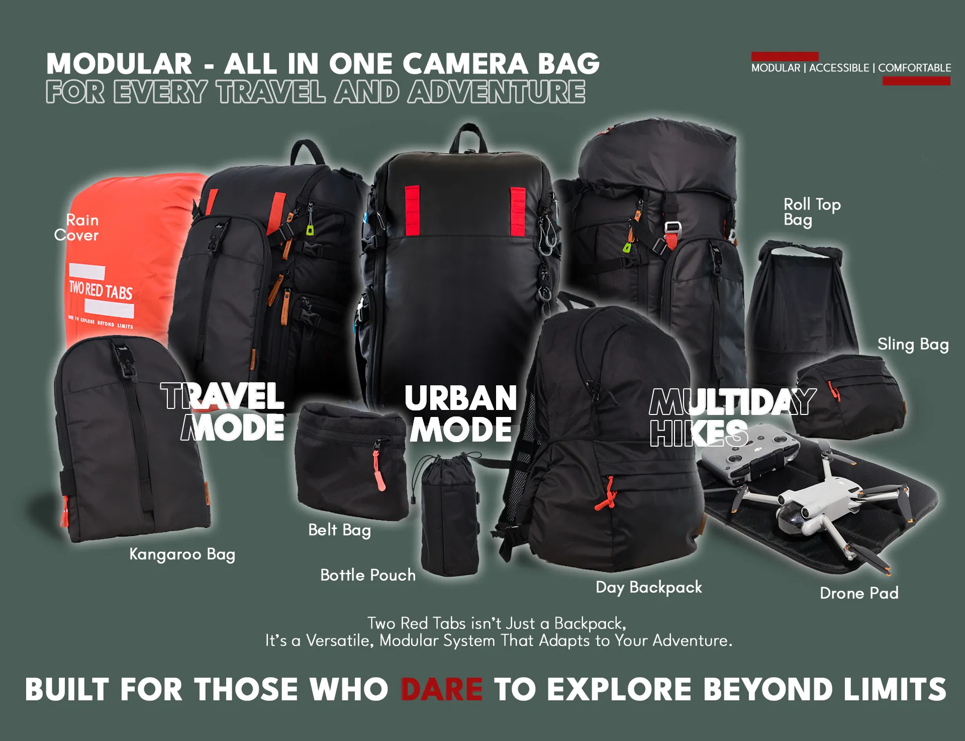 Two Red Tabs is designed with modular components that you can easily attach or detach according to your travel needs.